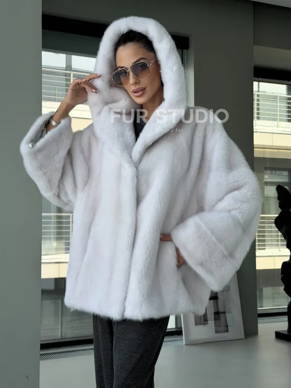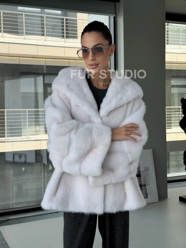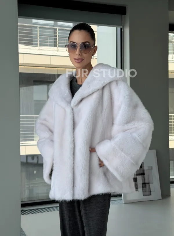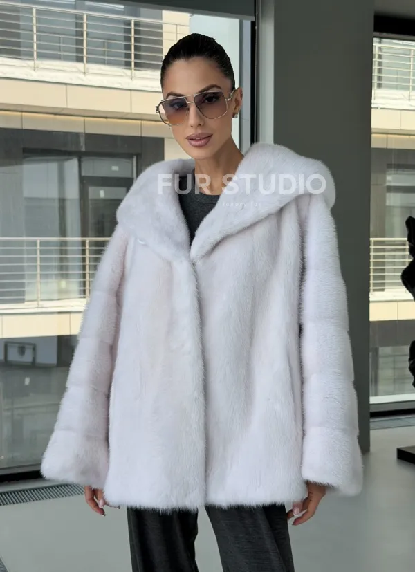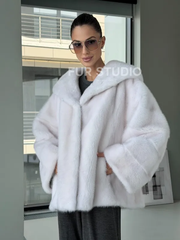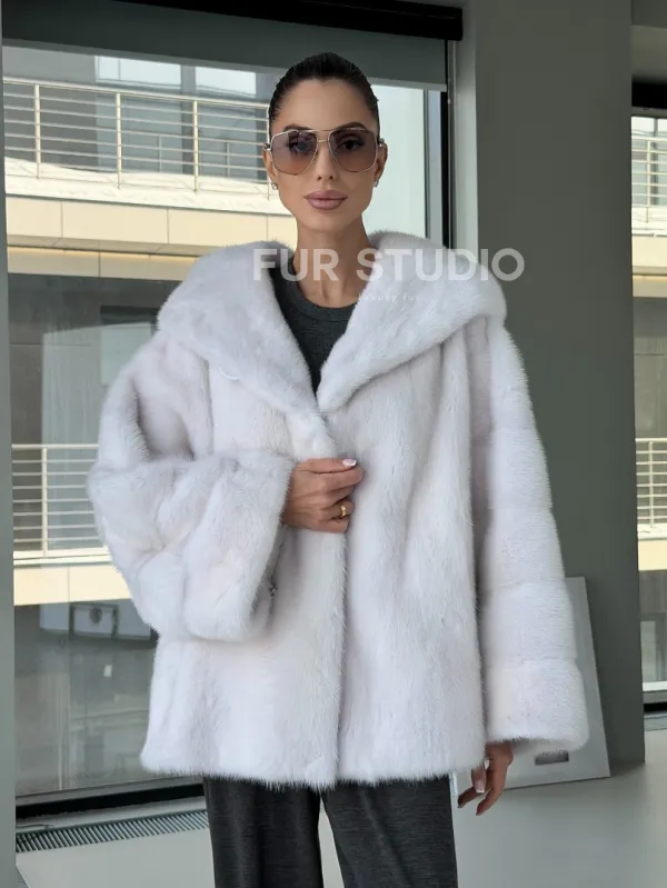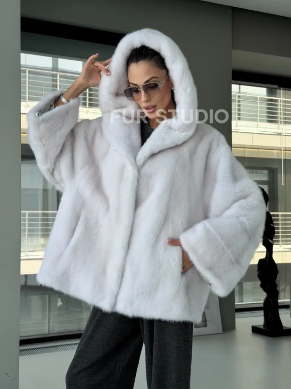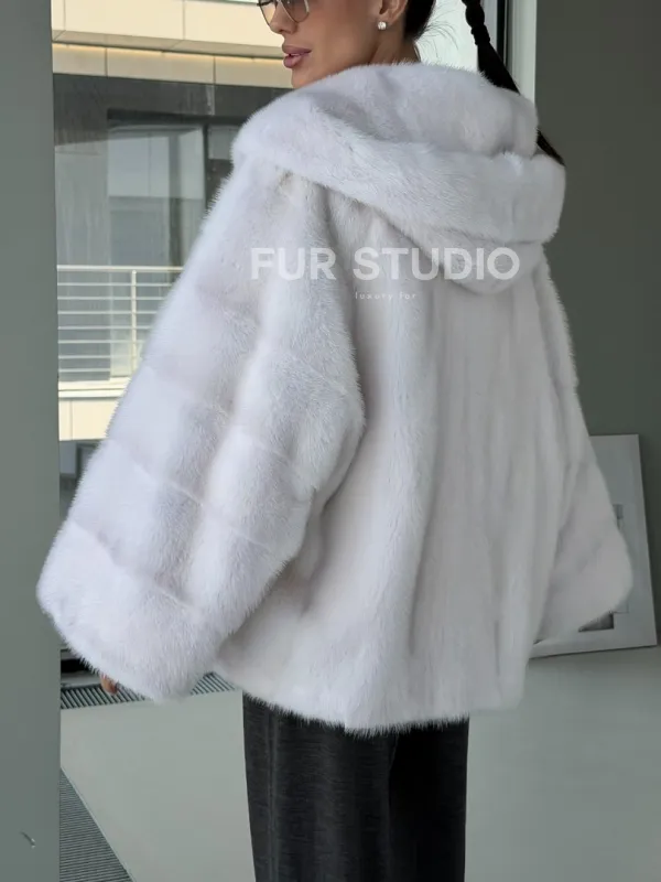 Белый норковый полушубок с капюшоном кобра 102879