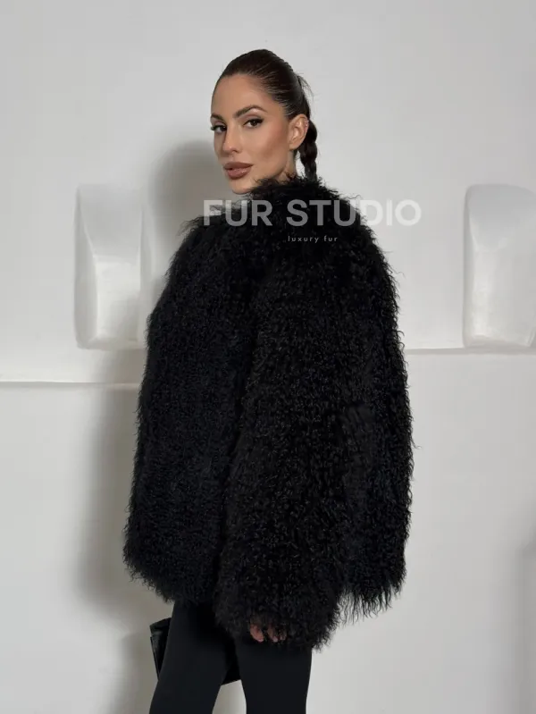 Черная шуба из меха ламы воротник шанель 101496