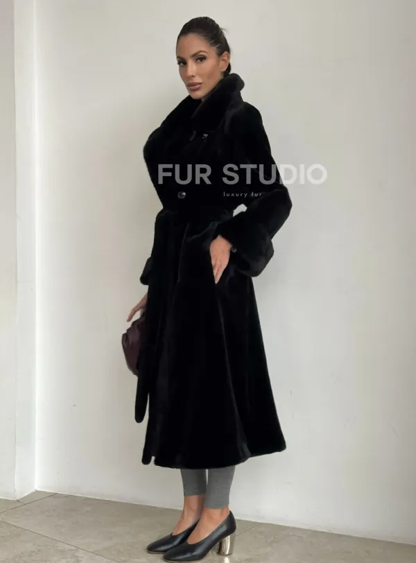 Мех данной шубы аукционная норка , цвет черный. Предлагается в размерах от 42 до 52. Длина модели 115-120 см, что выгодно подчеркивает фигуру девушек. Эта модель идеально подойдет для девушек и женщин, предпочитающих роскошные натуральные меха.
