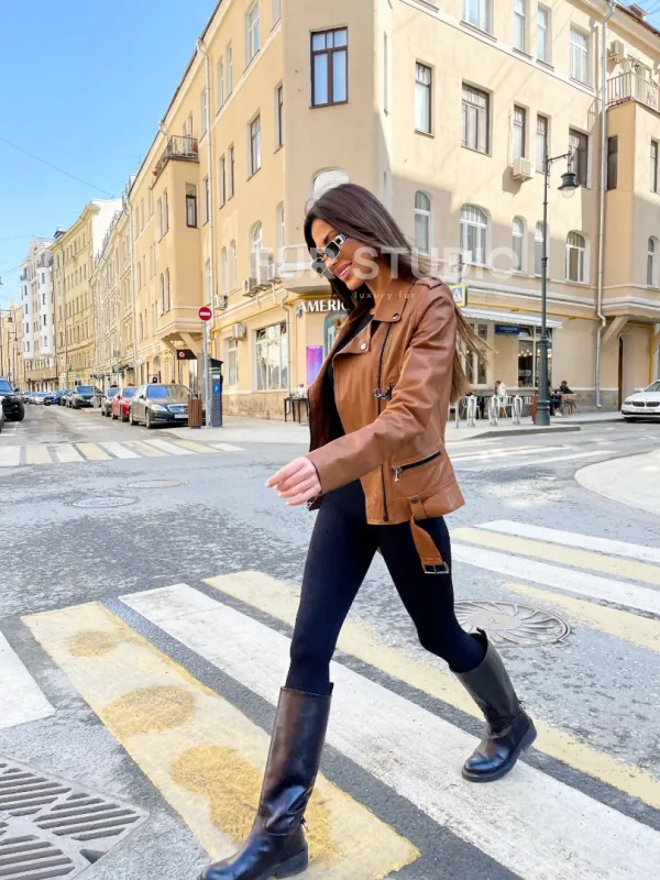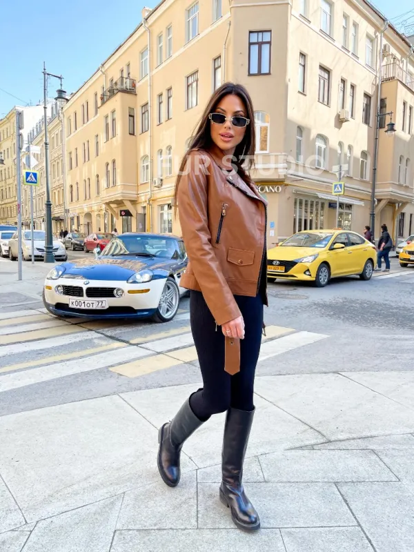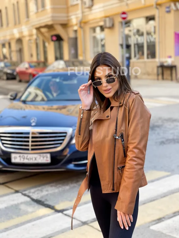 Косуха из натуральной кожи в цвете кэмел доступна для покупки в нашем шоуруме Furs Studio в , где также предоставляется удобная доставка во все города России.
