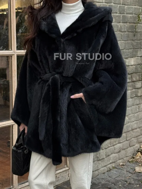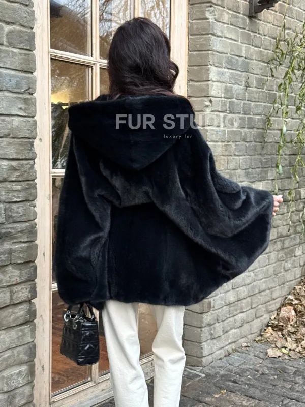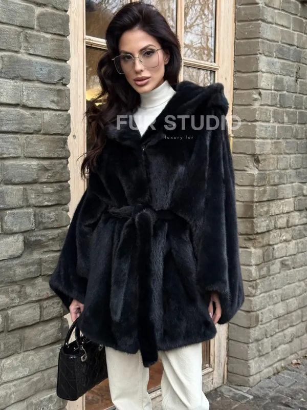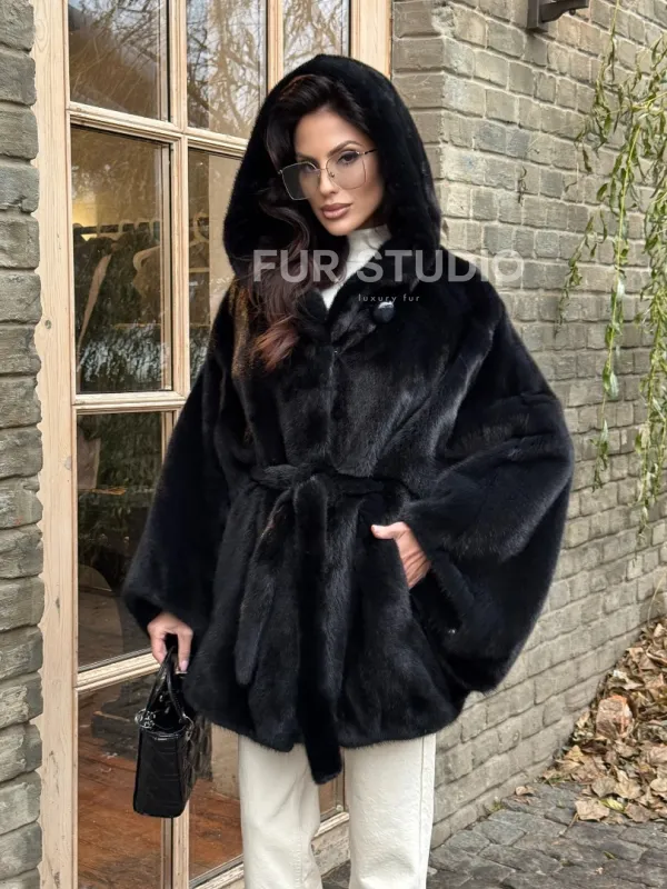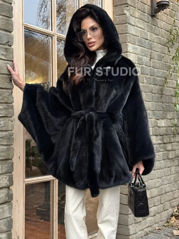 Меховое пончо из скандинавской норки с капюшоном - черный изумруд 101415