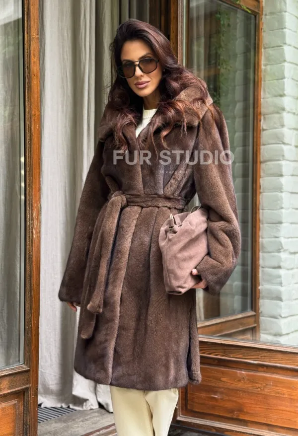 Норковая шуба с капюшоном - цвет орех 102240