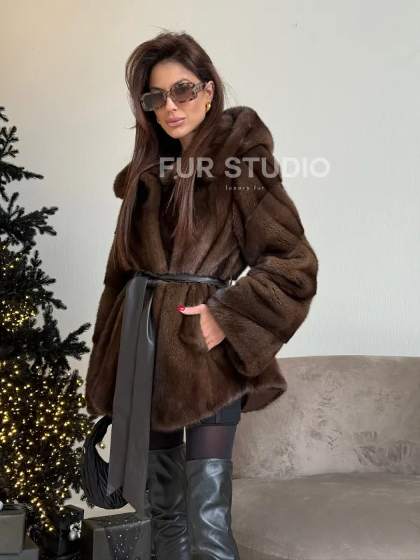 Норковый жакет с капюшоном, роспуск в цвете орех 100840