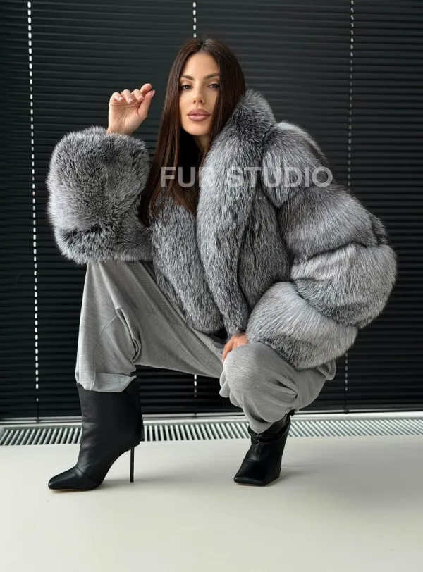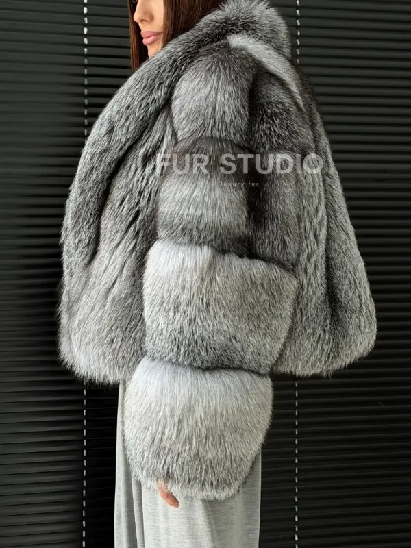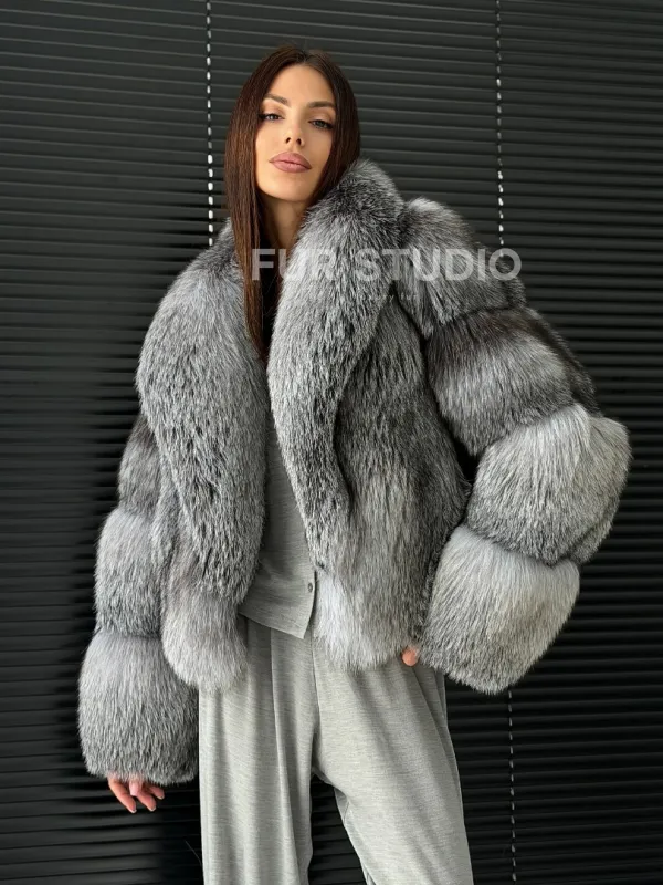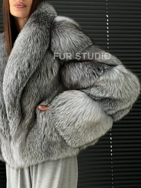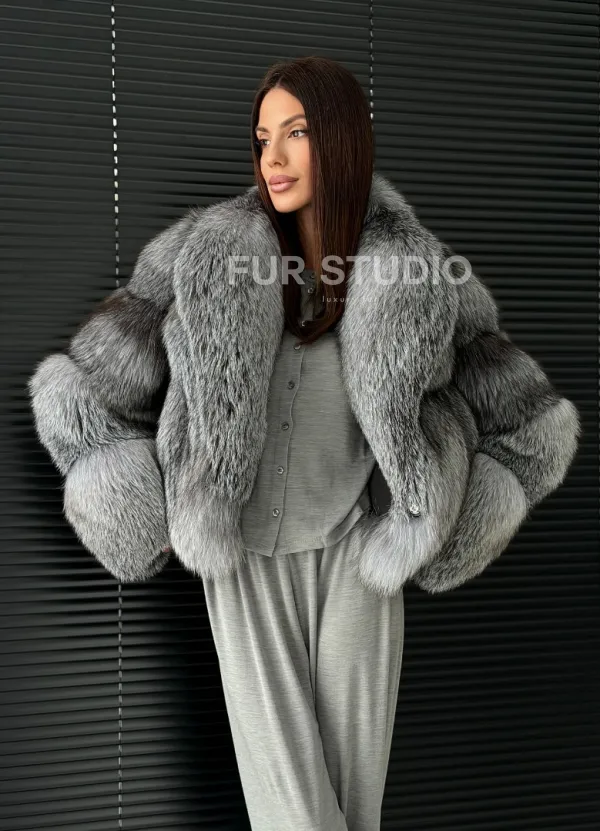 Мех данной шубы лиса, цвет серый. Предлагается в размерах от 42 до 50. Длина модели 50-55 см, что выгодно подчеркивает фигуру девушек. Эта модель идеально подойдет для девушек и женщин, предпочитающих роскошные натуральные меха.