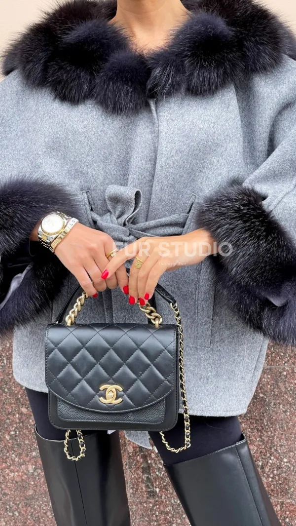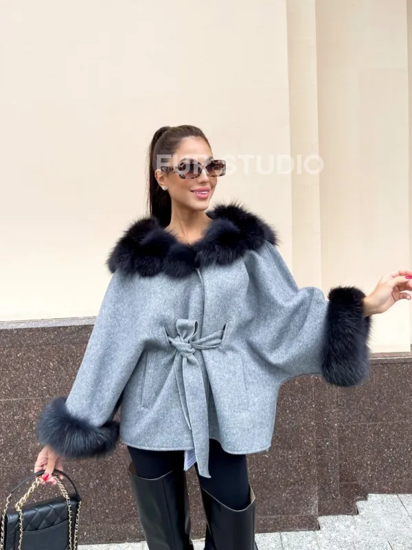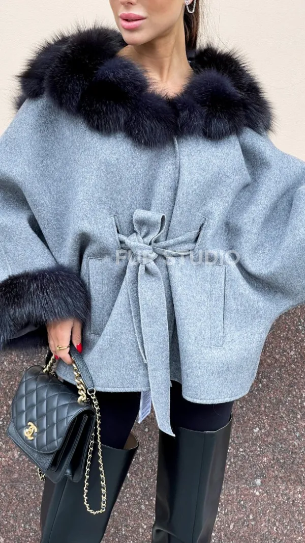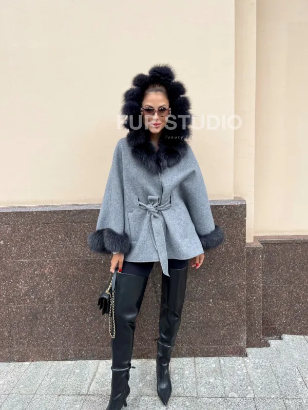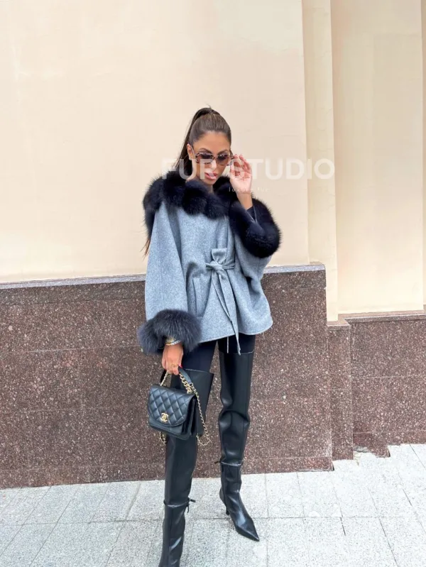 Пончо из натуральной шерсти с капюшоном из песца 100283