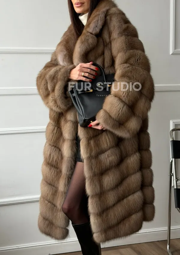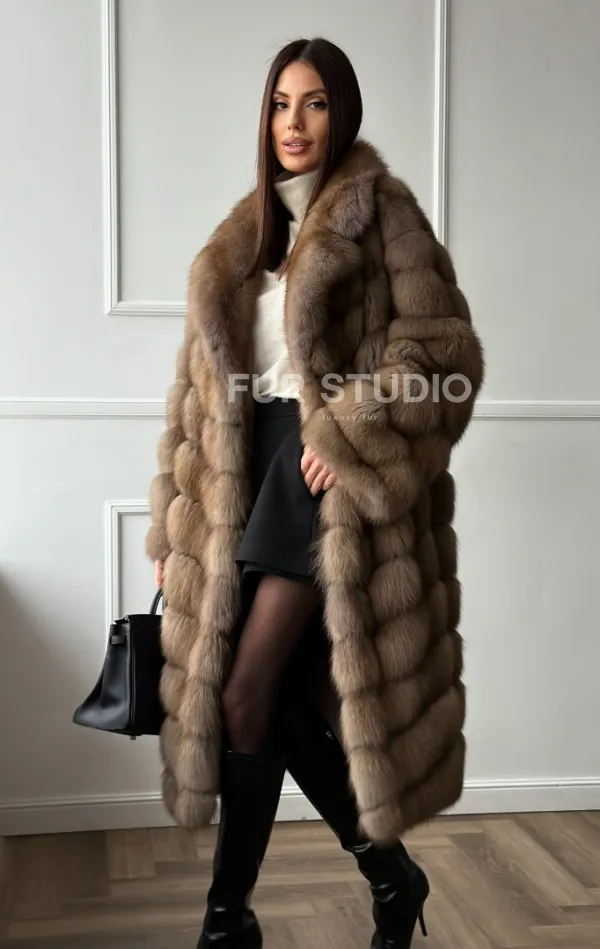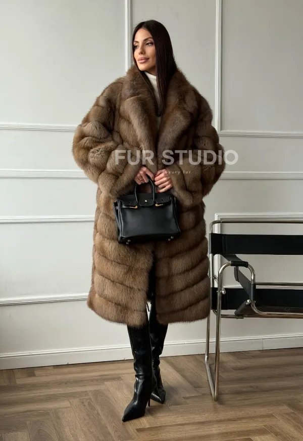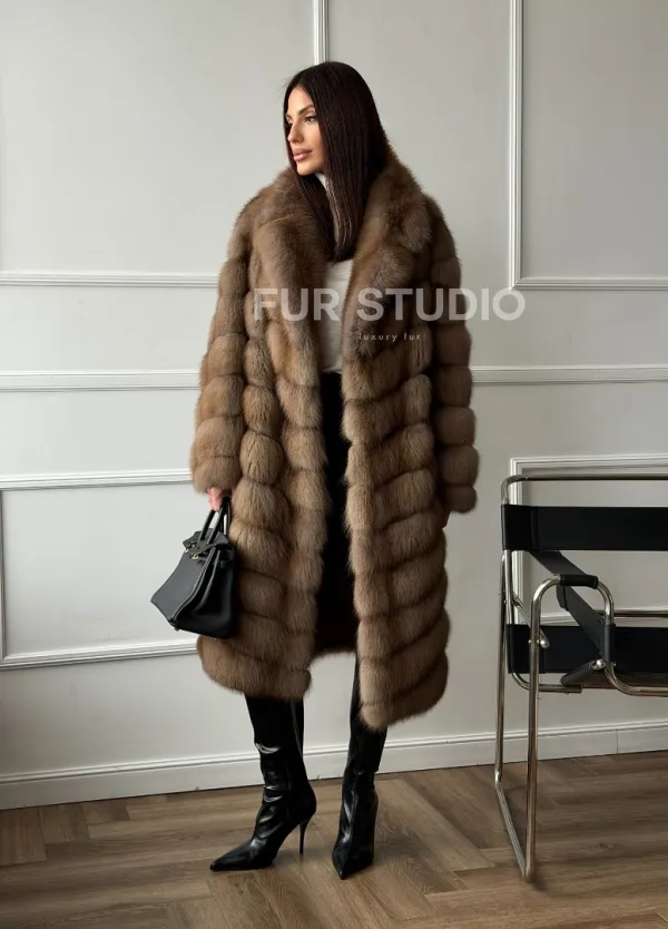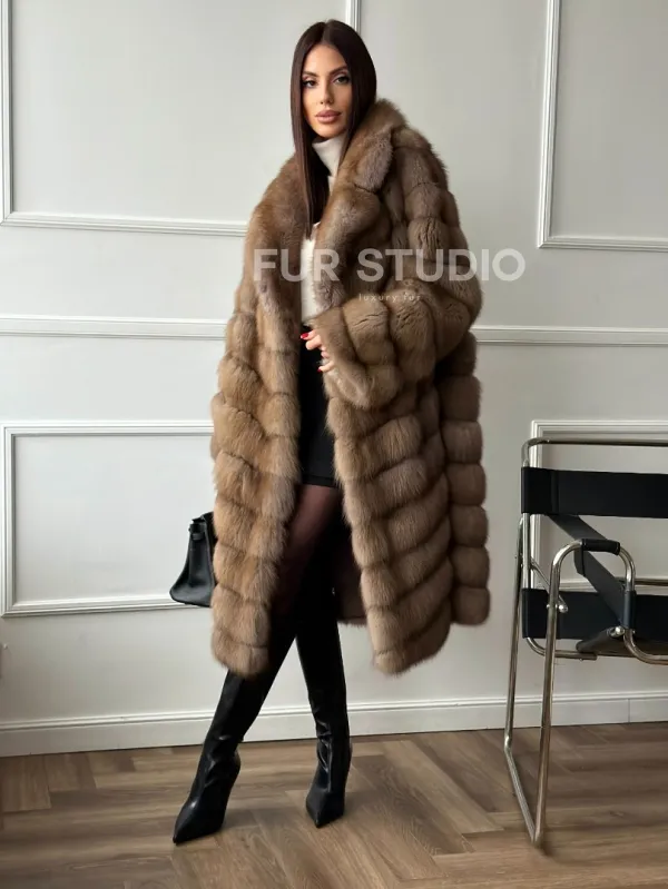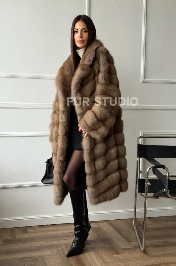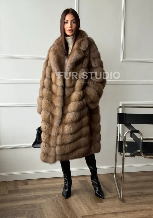 Мех данной шубы лесная куница, цвет натуральный. Предлагается в размерах от 42 до 50. Длина модели 105-110 см, что выгодно подчеркивает фигуру девушек. Эта модель идеально подойдет для девушек и женщин, предпочитающих роскошные натуральные меха.