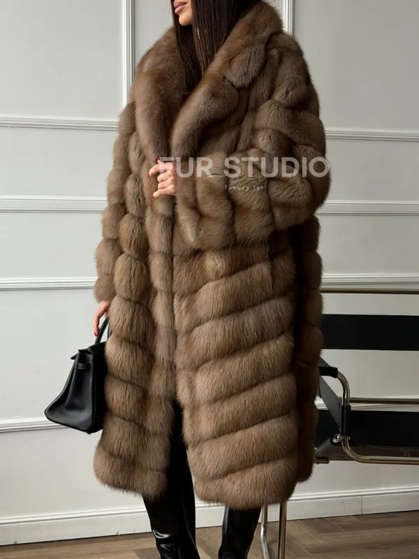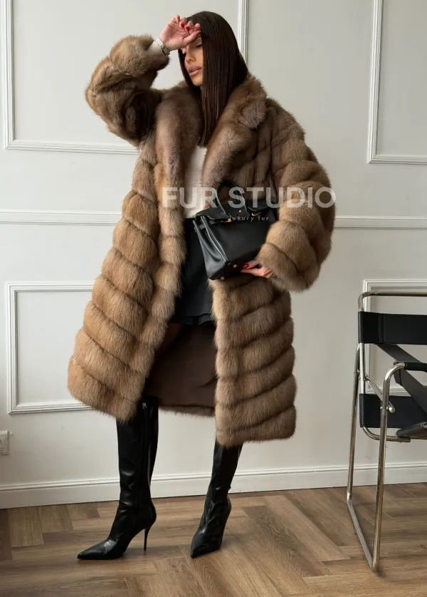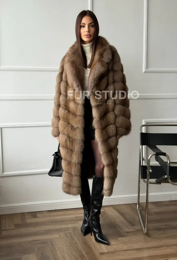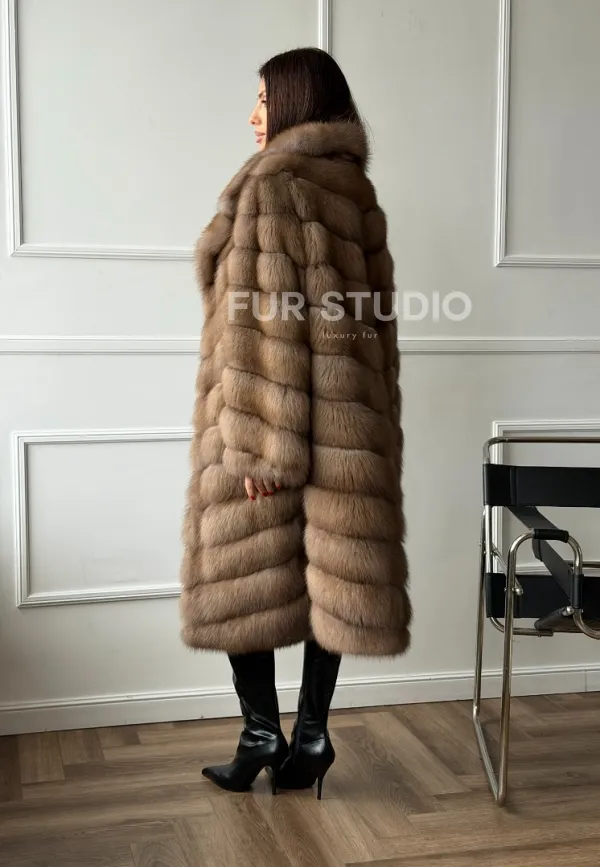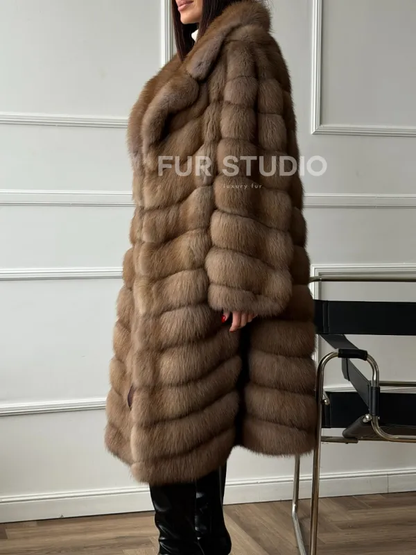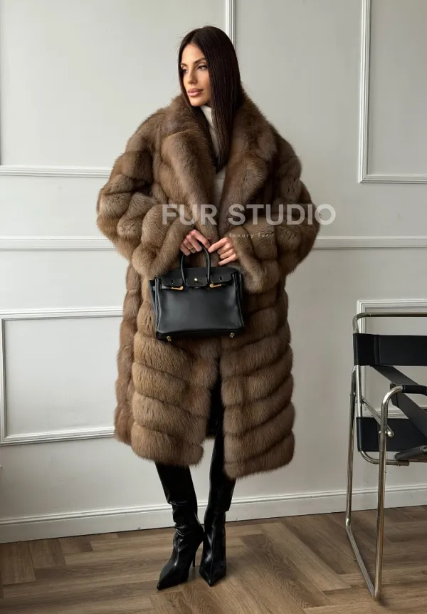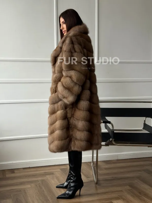 Мех данной шубы лесная куница, цвет натуральный. Предлагается в размерах от 42 до 50. Длина модели 105-110 см, что выгодно подчеркивает фигуру девушек. Эта модель идеально подойдет для девушек и женщин, предпочитающих роскошные натуральные меха.
