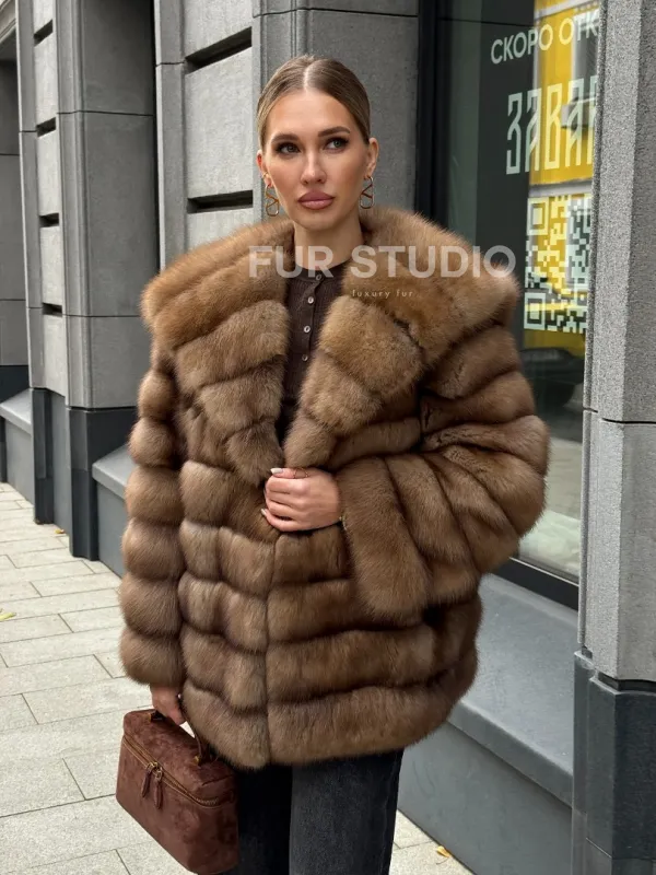 Шуба из натурального меха куницы с капюшоном 102364
