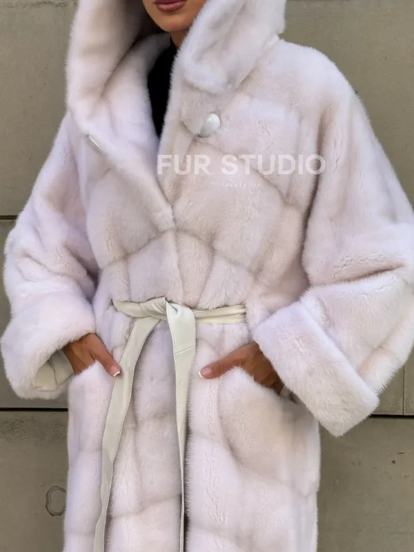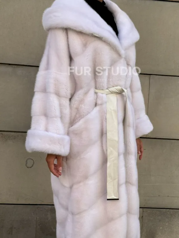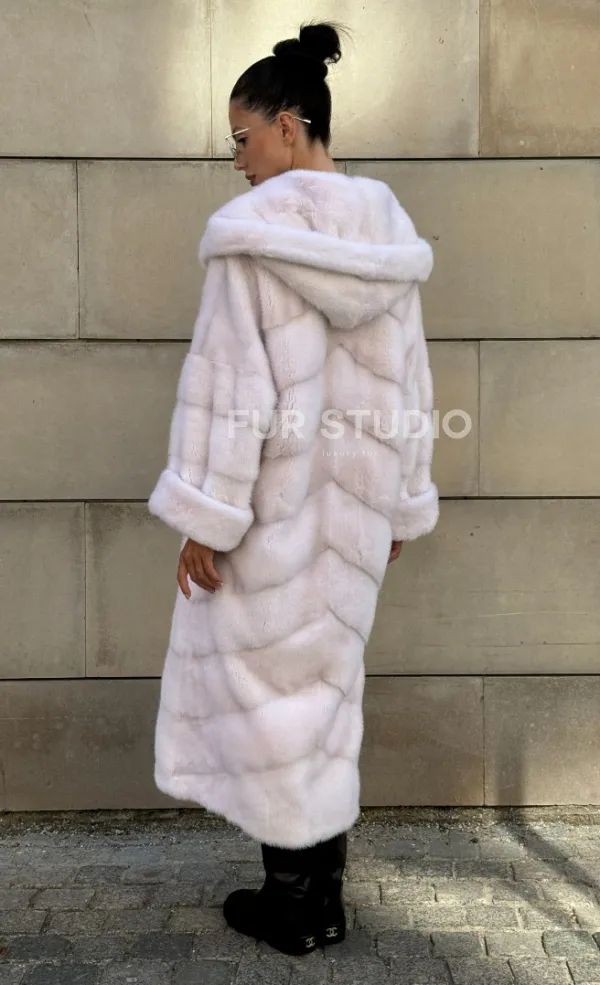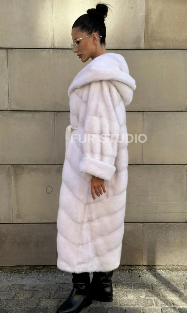 Шуба в диагональной выкладке меха норки White ice с капюшоном 101069