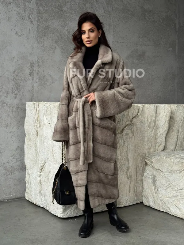 Удлинённая норковая шуба с поясом 102479