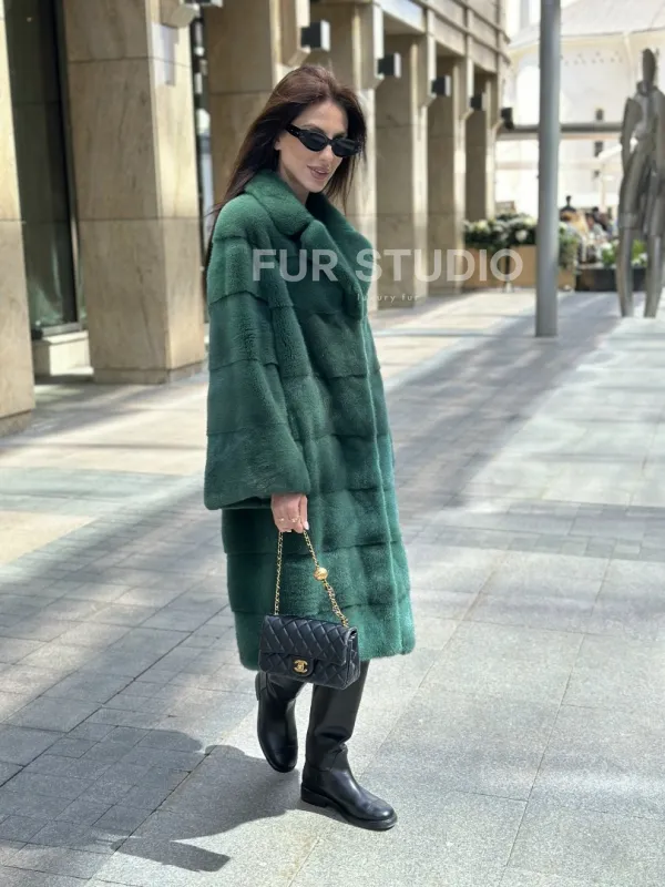 Мех данной шубы аукционная норка , цвет зеленый. Предлагается в размерах от 42 до 52. Длина модели 95-100 см, что выгодно подчеркивает фигуру девушек. Эта модель идеально подойдет для девушек и женщин, предпочитающих роскошные натуральные меха.