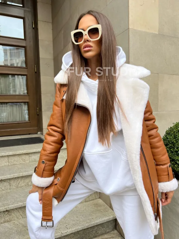 Женская дубленка авиатор в цвете виски – выбор современных девушек. Модель авиатор хит этого года. В дубленке будете выглядеть стильно и ярко вне зависимости от времени года. Яркая расцветка отлично гармонирует с любым цветом волос. Теплая подкладка позаботится о том, чтобы владелица не замерзла в сильные холода. Шикарный воротник подчеркнет изгибы шеи и согреет ее от непогоды.